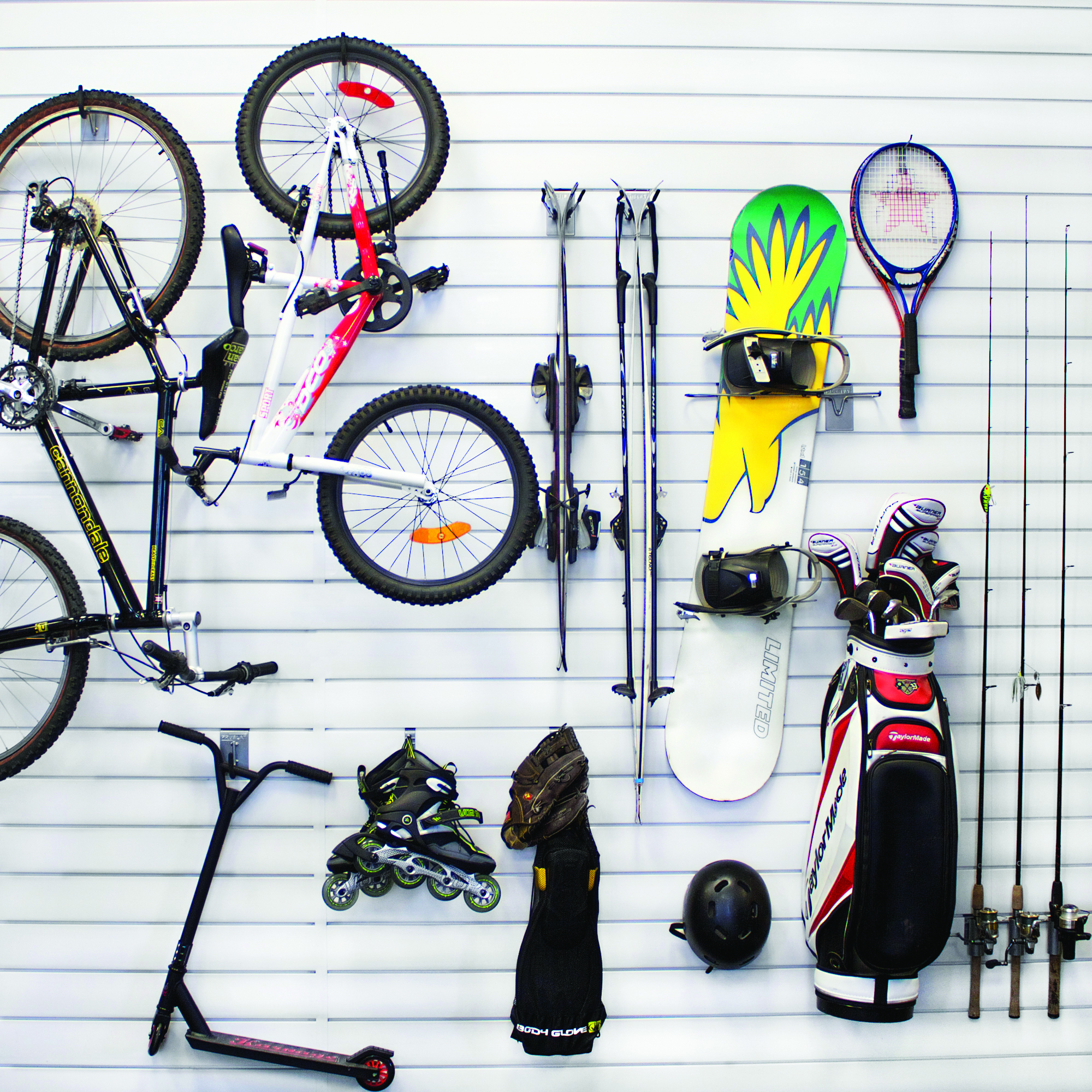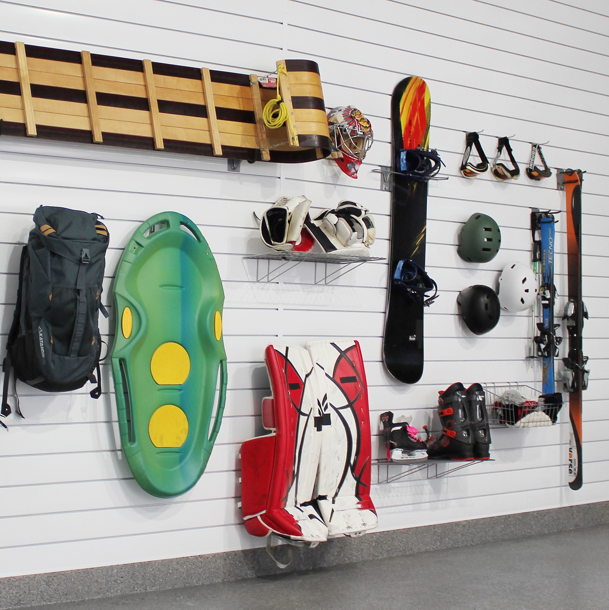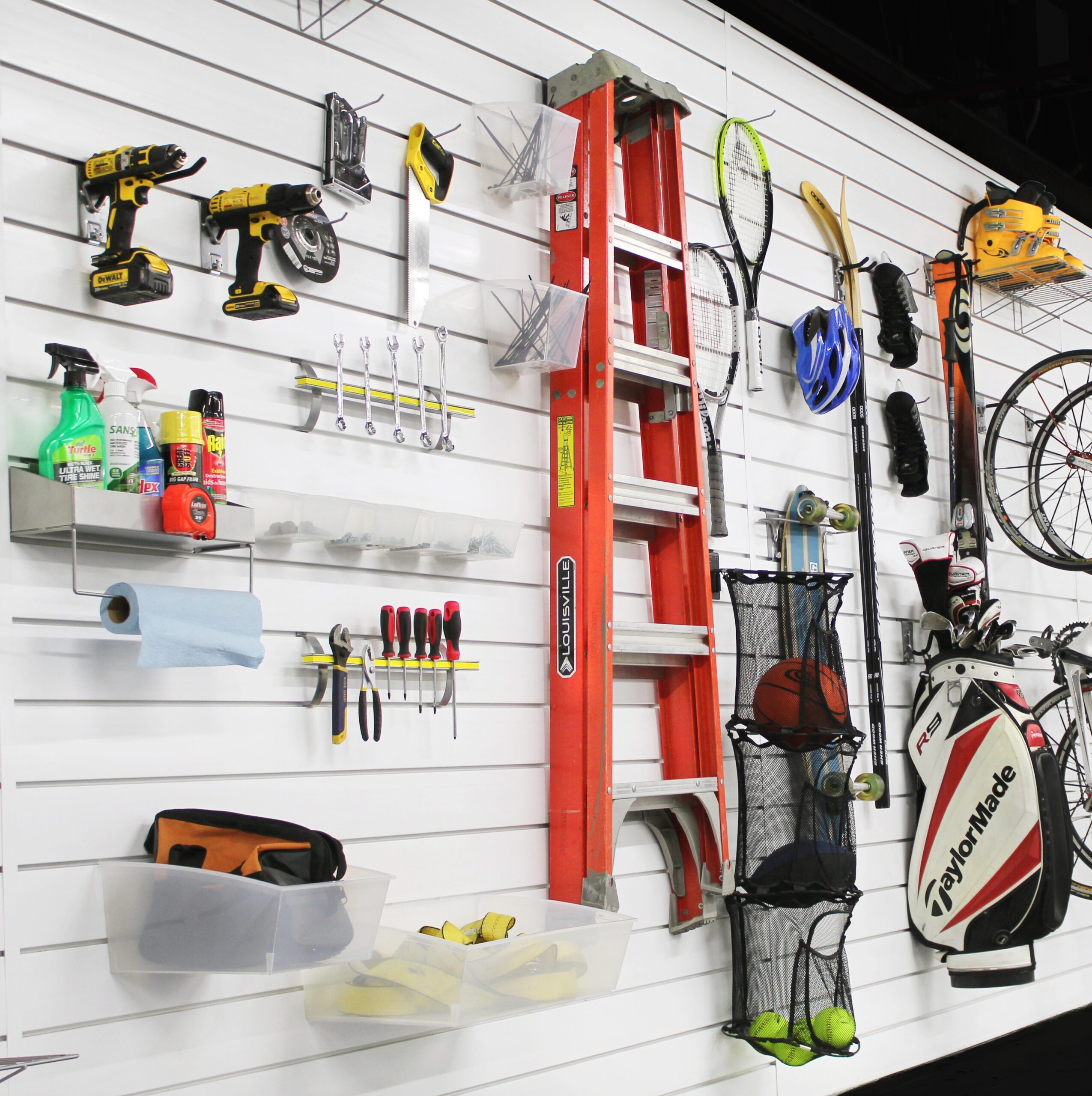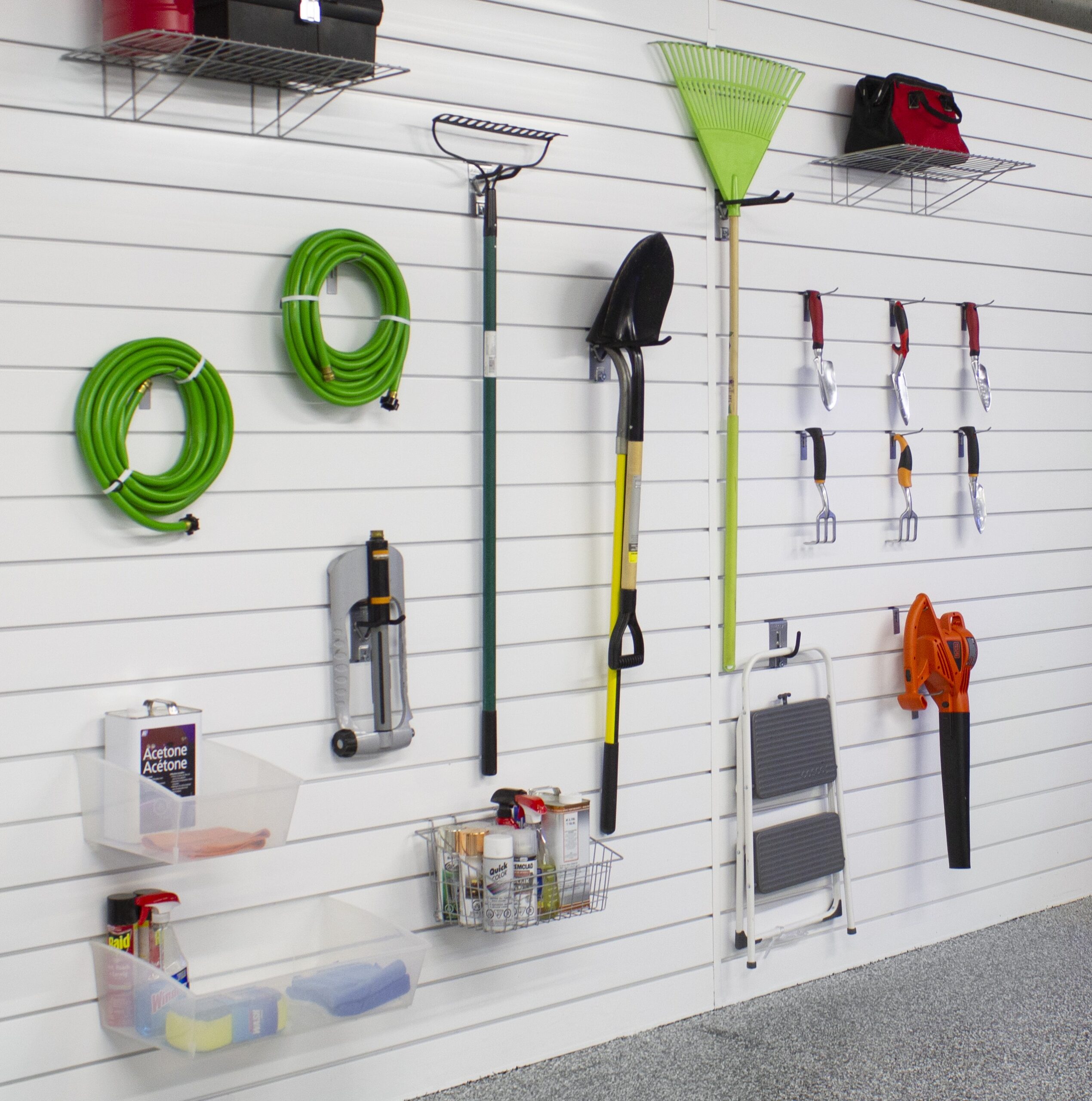 We stock over 20 different accessories including shelves, bins, baskets, hooks, sports racks, and more. All accessories are made to lock securely into our panel system.